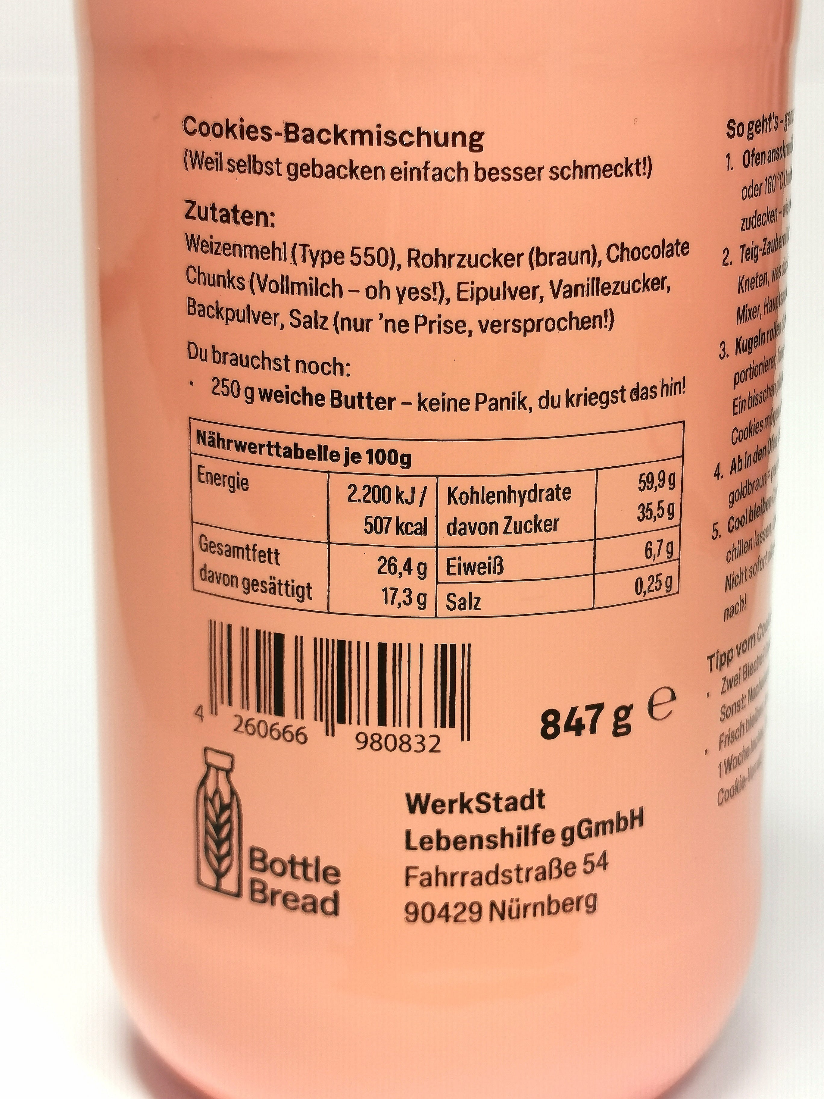 Weizenmehl (Type 405), Rohrzucker, Chocolate Drops, Eipulver, Vanillezucker, Backpulver, Salz. Hinweis: Sie fügen noch 250 g Butter hinzu