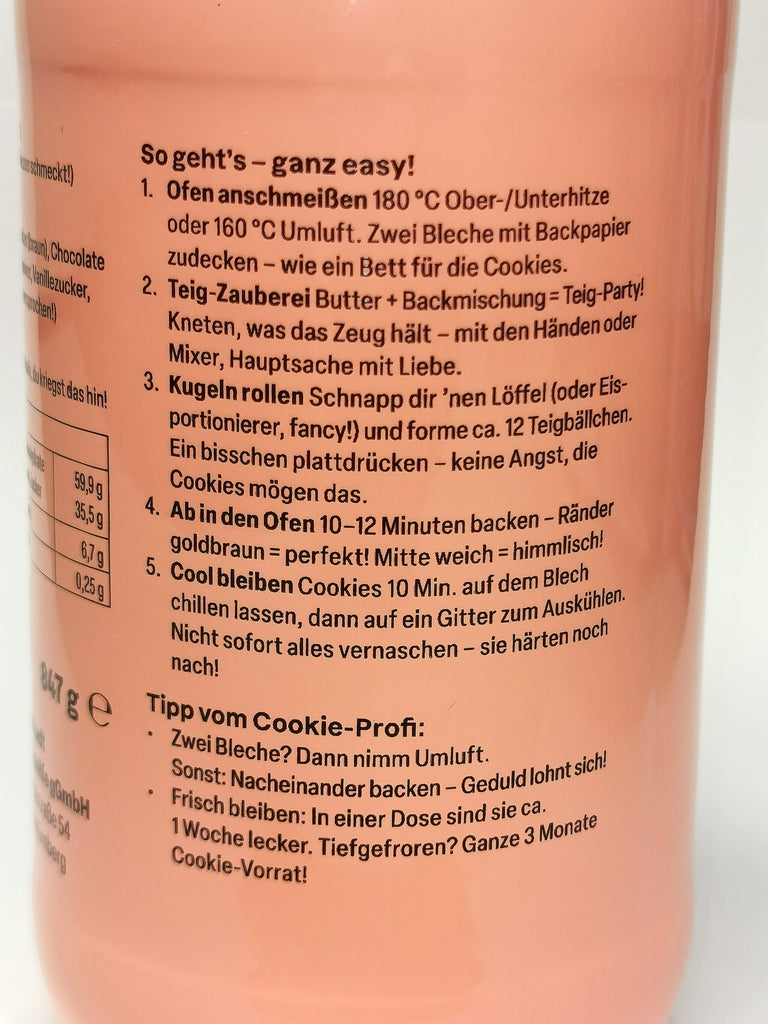 Dank der sorgfältig ausgewählten Zutaten wie Weizenmehl, Rohrzucker, Chocolate Drops, Eipulver, Vanillezucker, Backpulver und einer Prise Salz gelingt der Teig immer perfekt. Die Cookies sind außen leicht knusprig, innen weich und saftig – ideal für den Kaffeetisch, als Snack zwischendurch oder als liebevolles Geschenk.