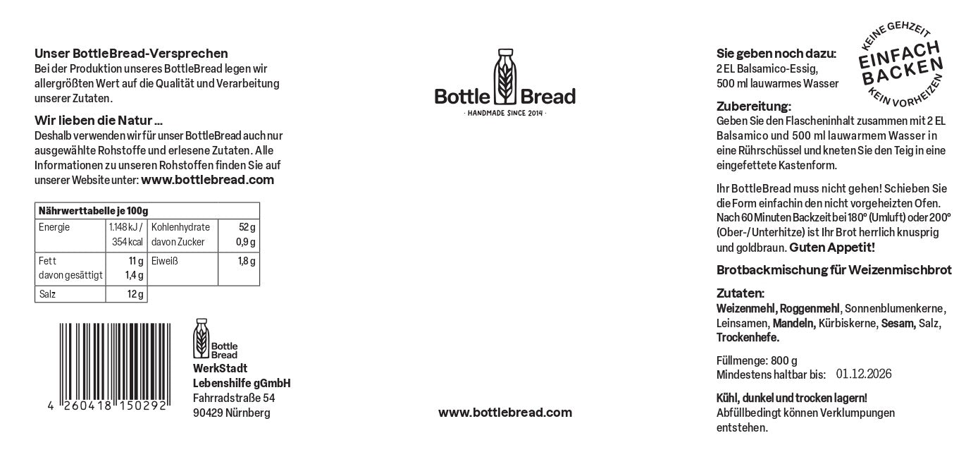 entsteht in unserer fränkischen Heimat das, was unser BottleBread ausmacht: Eine geschmackvolle Brotbackmischung mit dem besonderen Etwas.Die Zubereitung ist kinderleicht und das Brot (ca. 1.000g) schmeckt super lecker!